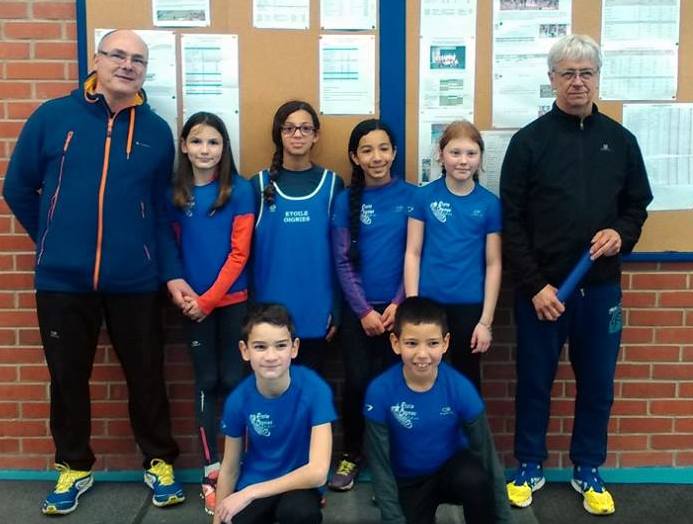 Pas de médaille en revanches en finales mais, Cerise sur le gâteau, le relais filles composé de Lilia Ould-Bouamama, Axelle Paternelle, Siham Ennassir et Chloé Bocquillon monte sur la deuxième marche du podium. Elles sont vice-championne du Pas-de-Calais. Bravo à elles et bravo à tous les participants. A noter les bonnes performances d’Axelle : 3,50 m. en longueur, de Siham : 8,34 et de Chloé : 8,38 au 50m, de El-Amine 9,82 au 50H et de Hugo : 7,85 au 50m et 9ème au triathlon. La relève est en marche !