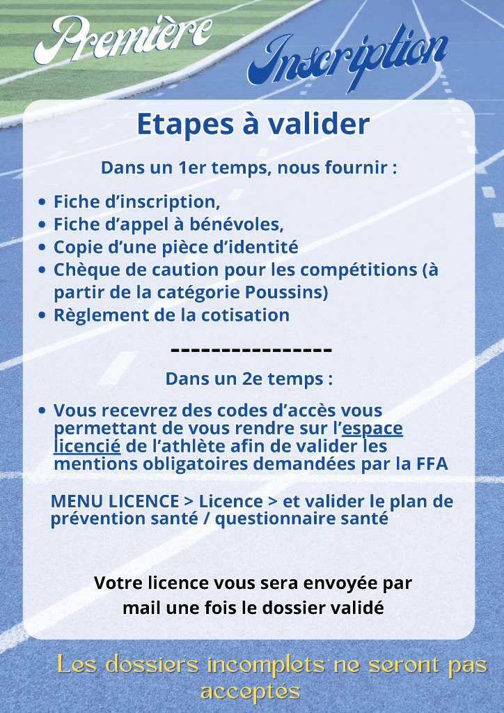 - Pour les poussins à Masters : Un chèque de caution de 50€ pour la participation aux compétitions. Non encaissé si l’athlète a participé à au moins 5 rencontres/compétitions sur la saison.